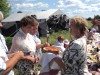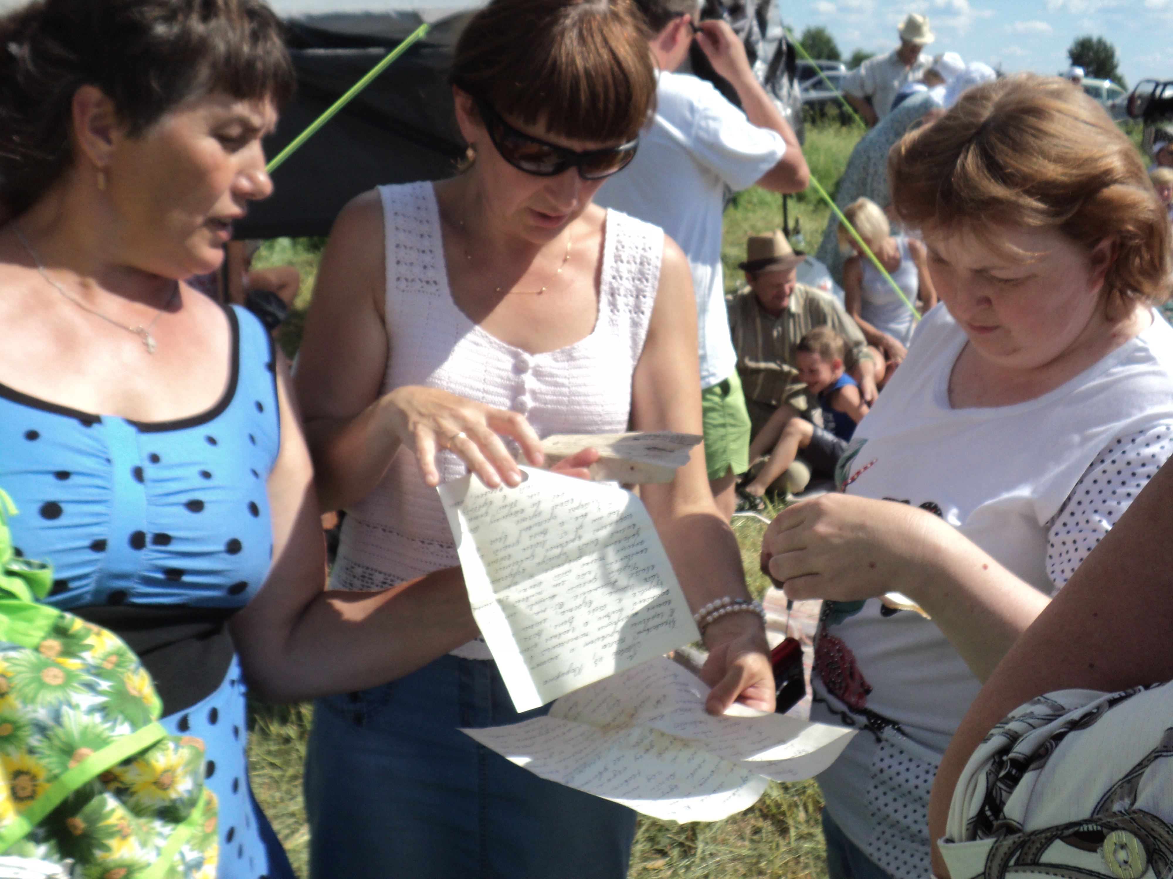 На Великую Отечественную войну ушли все трудоспособные мужчины. Не вернулись 22 человека. Их память почтили минутой молчания все собравшиеся. У поклонного креста, установленного в заброшенной деревне красавинским самодеятельным поэтом Владимиром Ивановичем Байбородиным, сфотографировались на память. Расстелили скатерти прямо на земле. Выложили еду, привезенную с собой. Помянули предков. Самые любопытные заглянули в оставшиеся избы, полуосевшие. Даже нашли пожелтевшие письма. Ведущие загадывали старые загадки, предлагали поиграть в старинные игры. К сожалению, сидеть на открытой солнечной полянке в тридцатиградусную жару было тяжело. Будь чуть попрохладнее и поменьше мошкары, было бы проще и легче и, возможно, засиделись бы до темна...